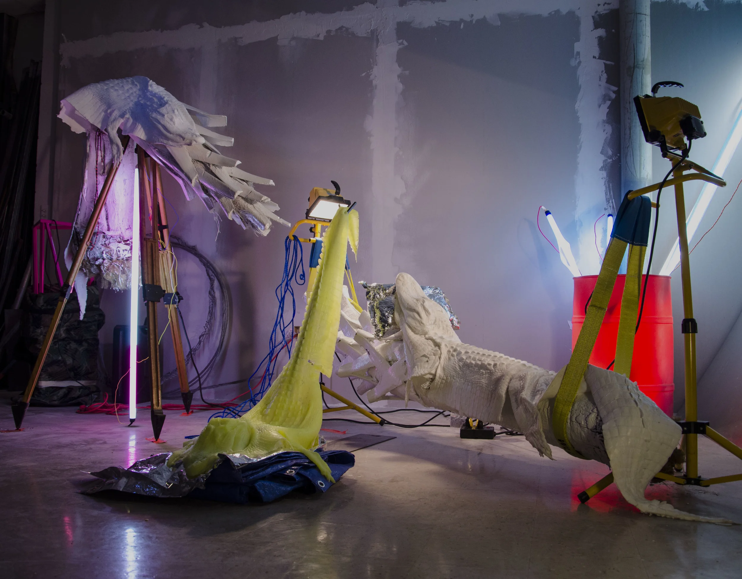 Cast silicone alligator hides, T-8 fluorescent bulbs, rope, construction floods, aluminum, vintage survey transit, sable palm, steel, plastic drum, mudded drywall, lifting straps, camo moving blankets, neon, blue tarp, parracord.